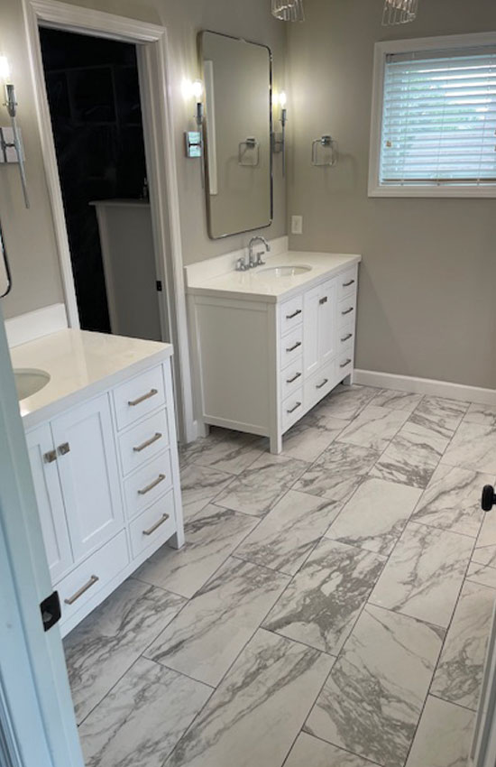 "Our master bathroom went from outdated and cramped to something that feels like a luxury hotel. The walk-in shower is incredible, the double vanity is exactly what we needed, and every finish — from the matte black hardware to the heated floors — is flawless. Garrett Construction made the whole process easy and stress-free."